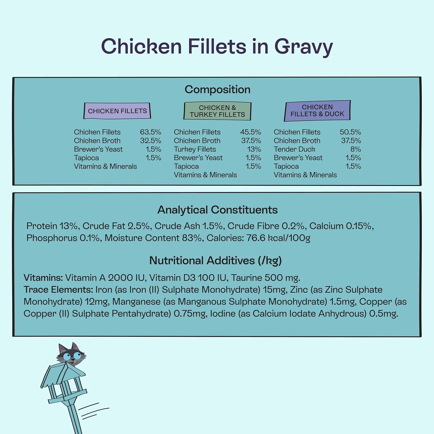 Treat your cat to a mouth-watering selection of premium British poultry served in delicious, rich gravy. This variety pack features tender chicken fillets with turkey and chicken fillets with duck - all slow-cooked in their own natural juices to create irresistible gravy that even the fussiest cats adore. Each pouch delivers a complete, balanced meal made with natural ingredients and essential vitamins and minerals for optimal feline health.