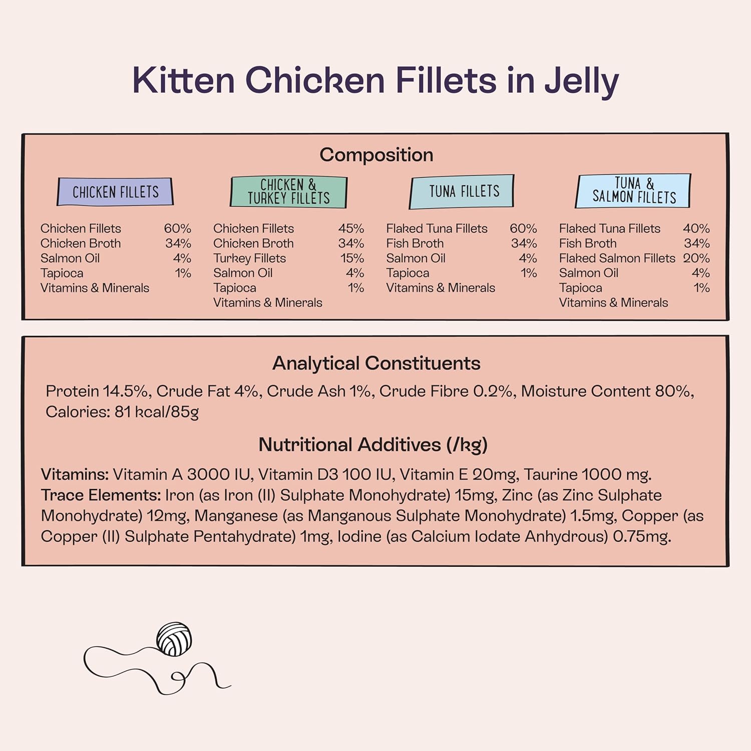 Give your growing kitten the nutritious start they deserve with this specially formulated variety pack. Featuring four complete recipes - chicken fillets, chicken with turkey, tuna fillets, and tuna with salmon - all served in delicious jelly enriched with salmon oil. Each pouch provides perfectly balanced nutrition designed to support healthy growth, development, and energy levels during those crucial early months.