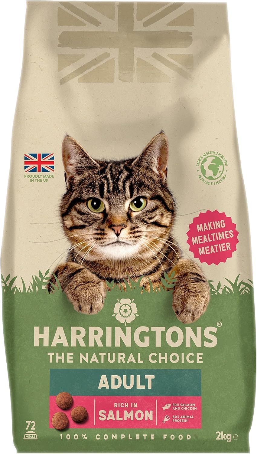 Does your cat deserve naturally meaty meals? Then treat them to Harringtons Complete Salmon Dry Cat Food. Rich in delicious salmon which provides a highly digestible source of protein for energy, growth and repair. This carefully formulated recipe contains all the wholesome nutrients and goodness your cat needs, with no artificial colours or flavours and no added wheat.