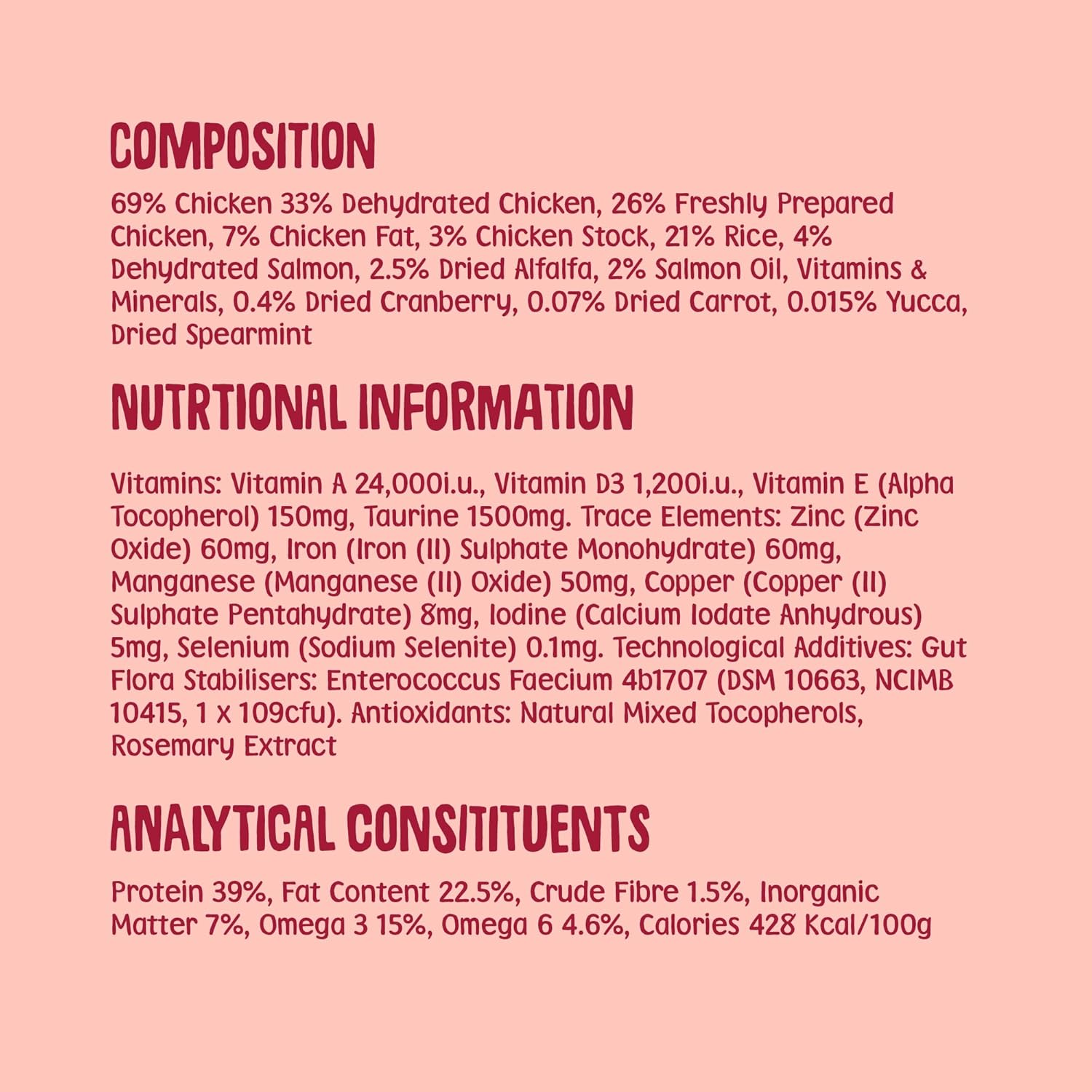 Treat your cat to a protein-packed meal that combines the best of land and sea. This natural dry cat food blends chicken with freshly prepared salmon to create an irresistible recipe that even the fussiest felines will love. Specially formulated for adult and senior cats, this complete food provides everything your cat needs for optimal health and vitality.