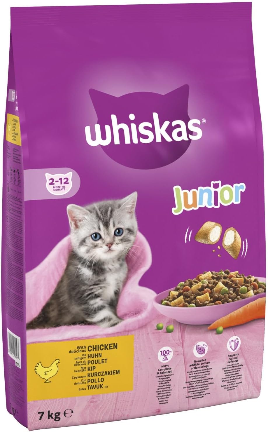 Whiskas Kitten Food in Chicken - Complete dry food containing calcium to support development for growing kittens up to 12 months old, carefully prepared, very digestible to help digestion, with increased energy content and proteins for healthy growth. Made with no added artificial colours or flavourings. Product by Mars Inc